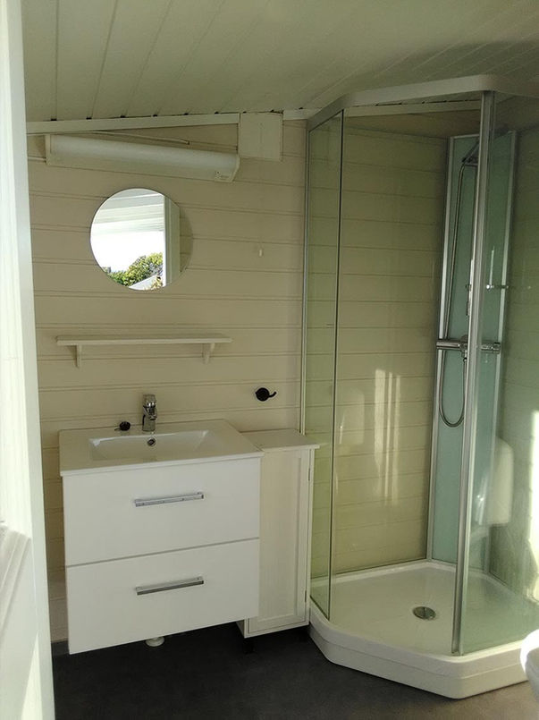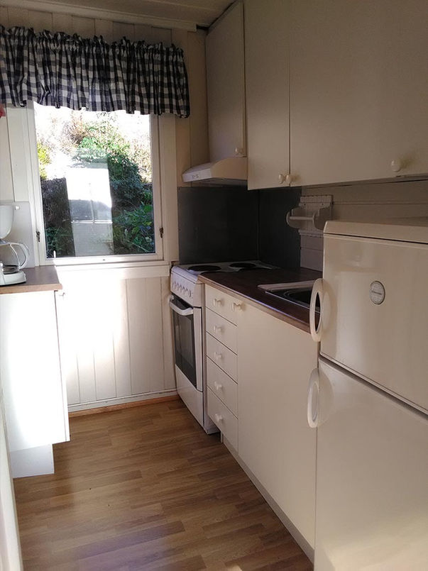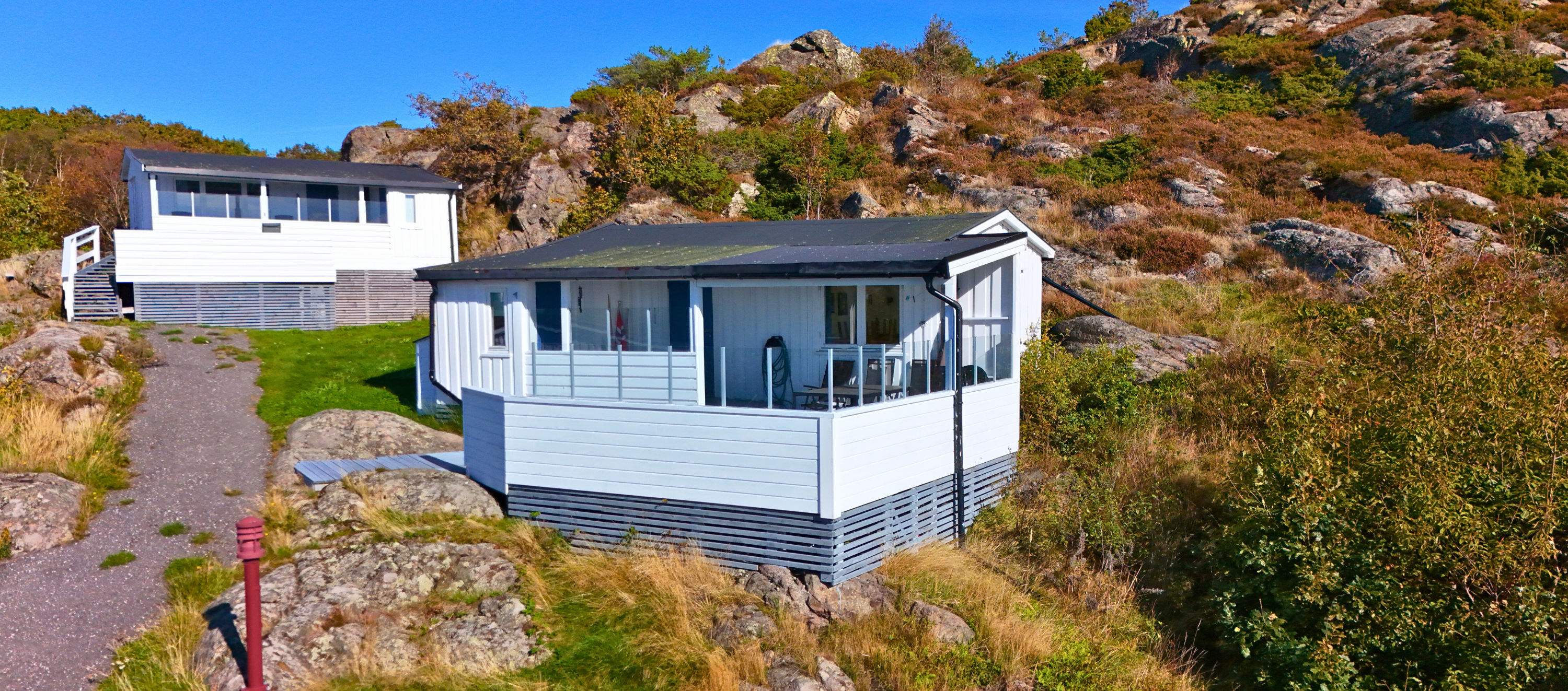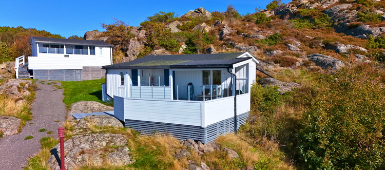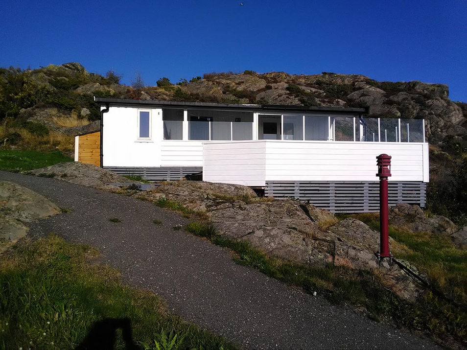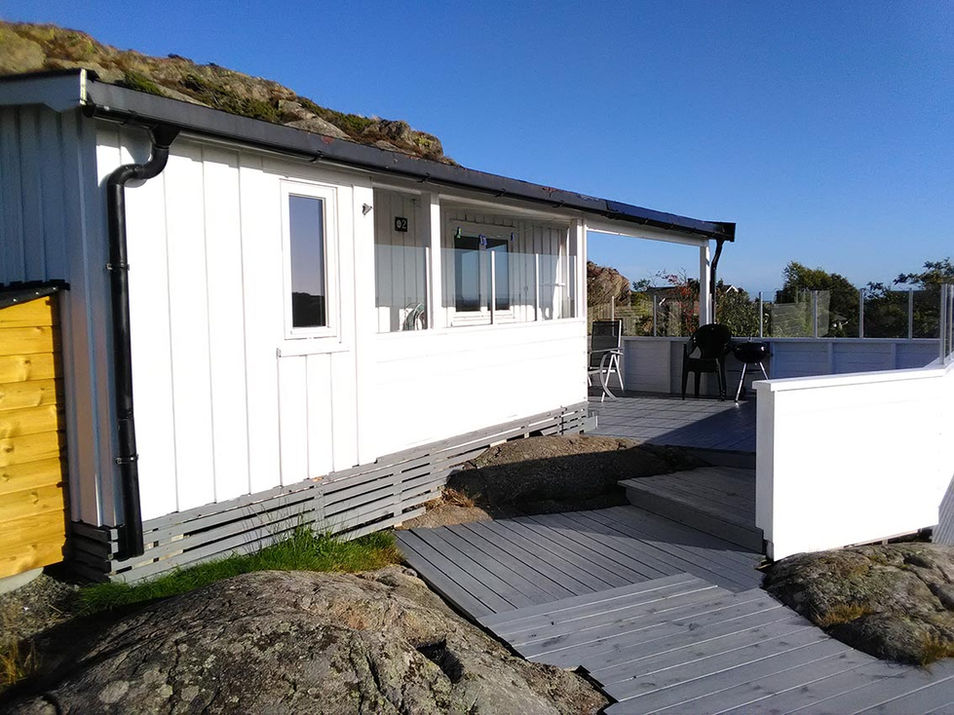 En koselig hytte som ligger opp en kort bakke med utsikt mot havet og campingplassen. Hytten har en romslig terrasse som er godt skjermet med glass satt på toppen av rekkverket. Badet har en egen inngang til rett uten for hyttedøren. Stranden finner man kun 300 m fra hytten.Kjøkkenet er utstyrt med et mindre kombiskap og en komfyr. På badet finnes det dusj og toalett med egen inngang utenfor hytten. Kabel-TV og wi-fi er inkludert i leieprisen.