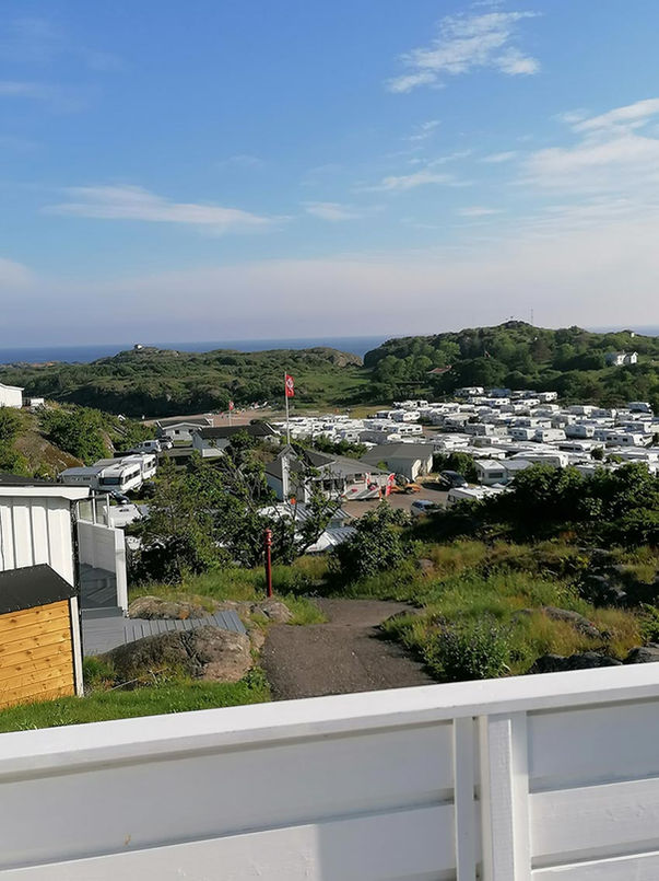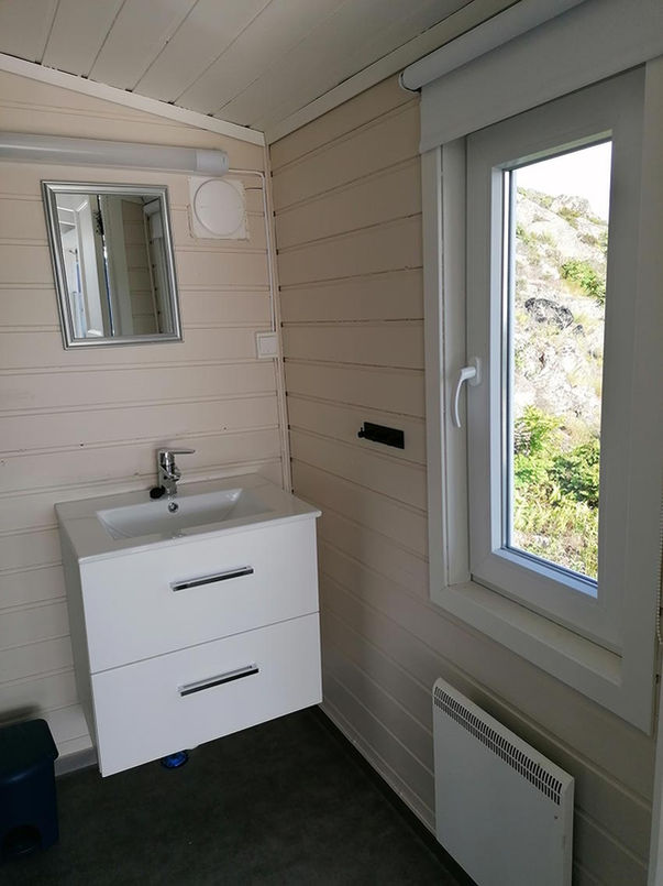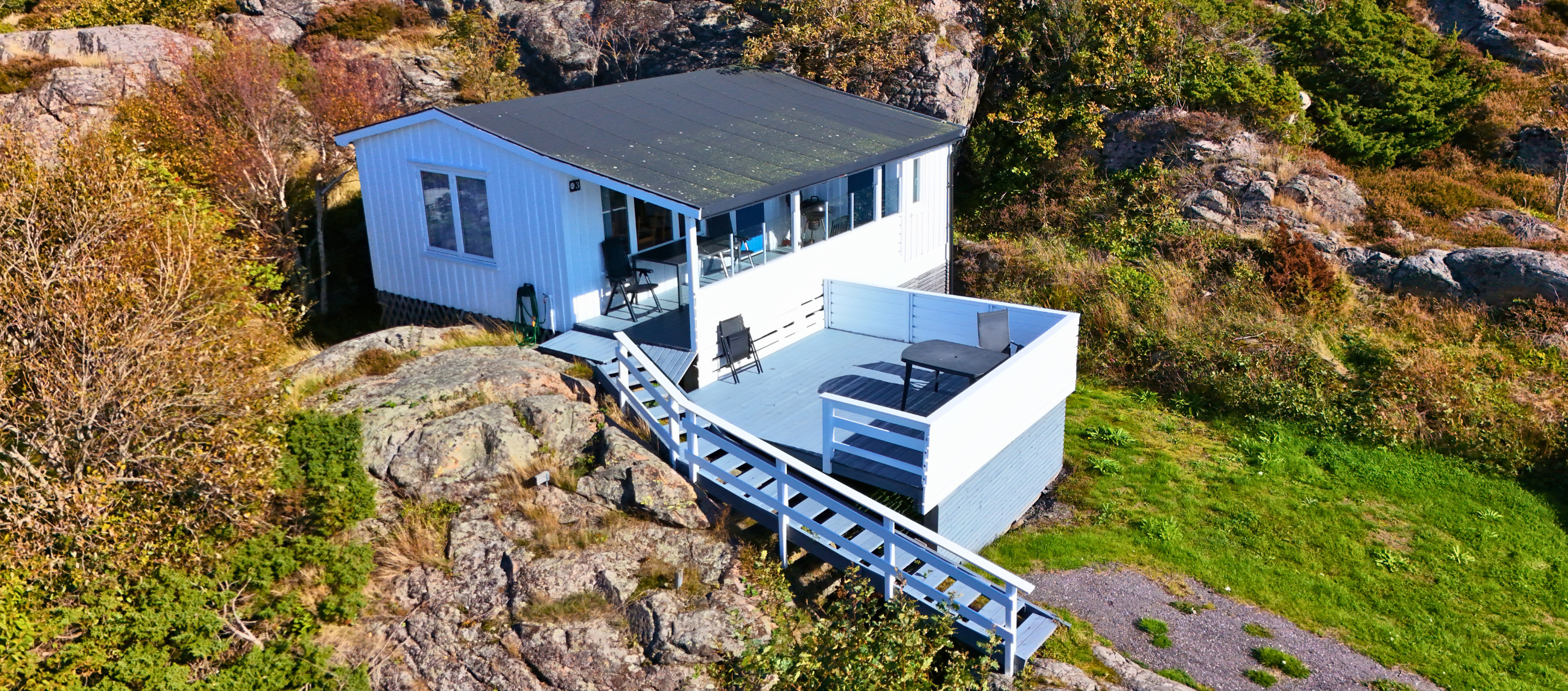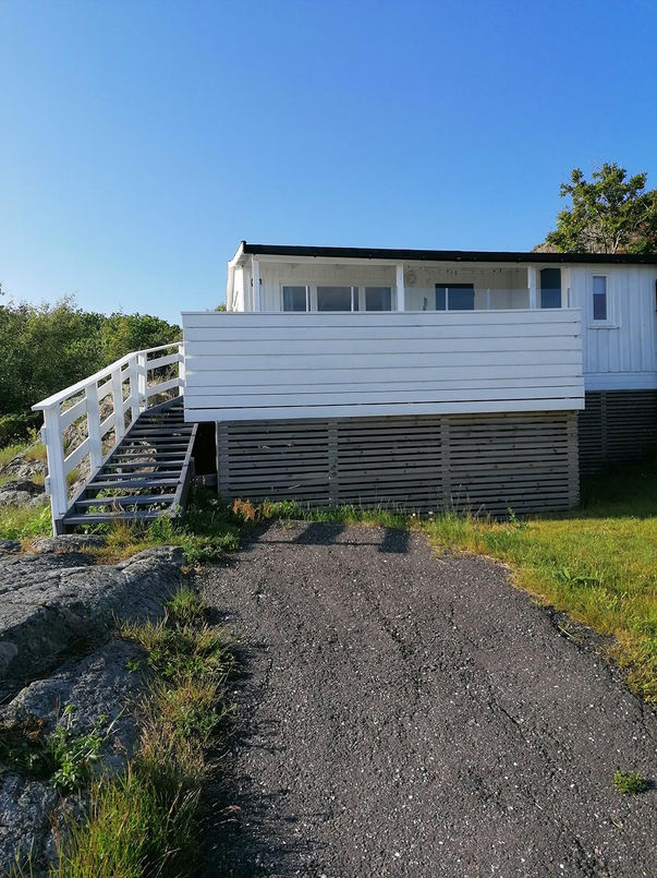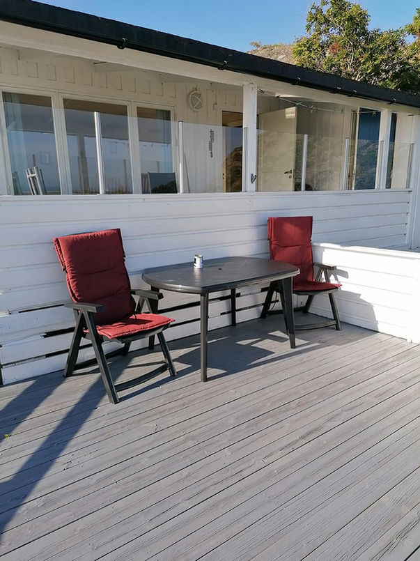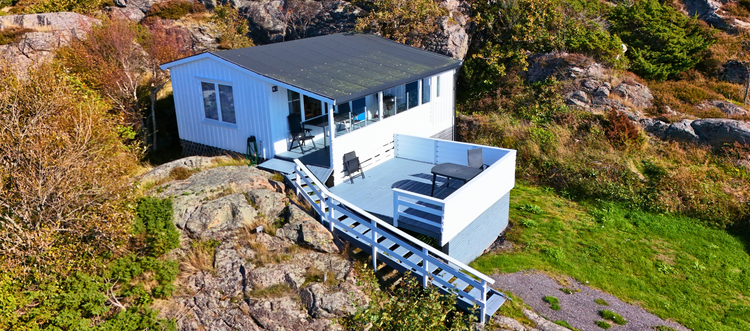 En koselig hytte som ligger på toppen av en bakke med havutsikt.  En todel terrasse med en åpen del utmerket til soling og grilling samt en skjermet del med tak mot inngangsdøren og badet. Det er en egen inngang til badet rett utenfor hyttedøren. Kort vei til stranda på kun 300 m.Kjøkkenet har et mindre kombiskap og en komfyr. Utenfor hytten finner man et bad med dusj og toalett. Kabel-TV og wi-fi er inkludert i leieprisen.