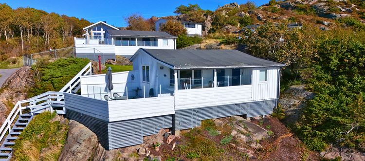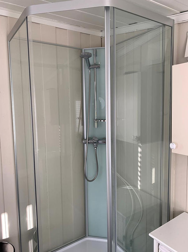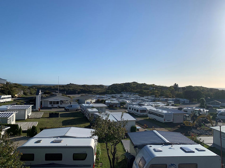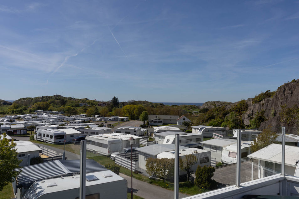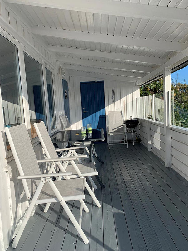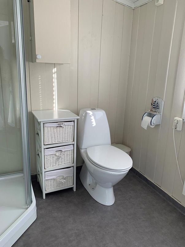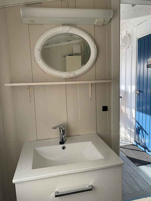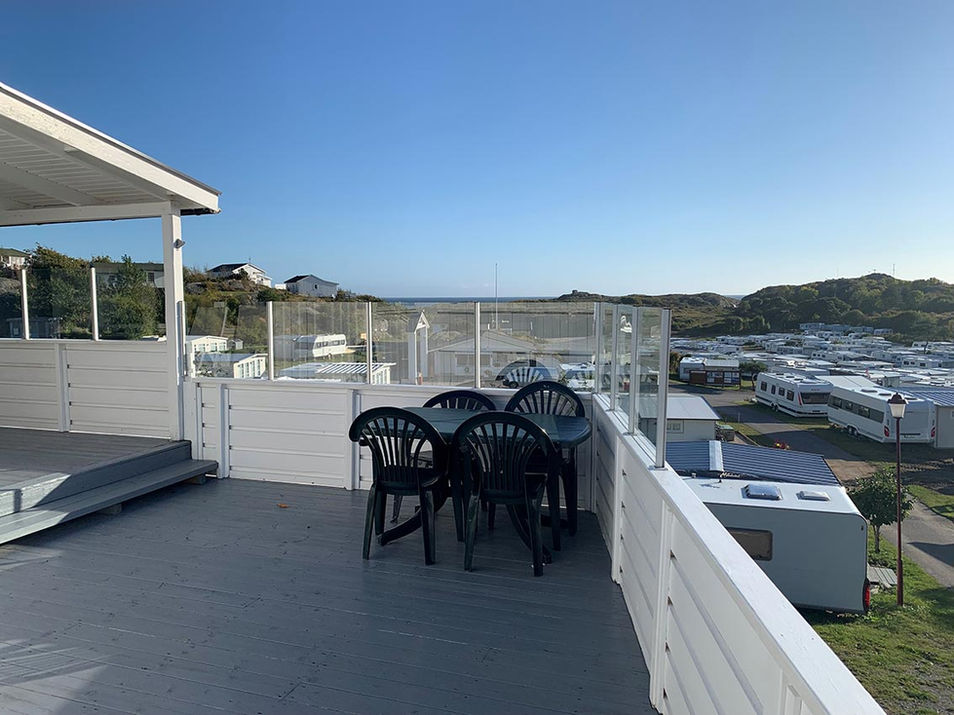 En koselig hytte med utsikt utover havet og campingplassen. En romslig terrasse med mulighet til å sitte skjermet under tak rett uten for hyttedøren. Egen inngang til badet uten for hytten. Kort vei til stranden med som man finner kun 300 m fra hytten.Hytten har et kjøkken utstyrt med komfyr og et mindre kombiskap. En hyggelig stue med spisebord som har utsikt ut fra hytten. Utenfor hytten finner man badet med toalett og dusj. Kabel-TV og wi-fi er inkludert i leieprisen.